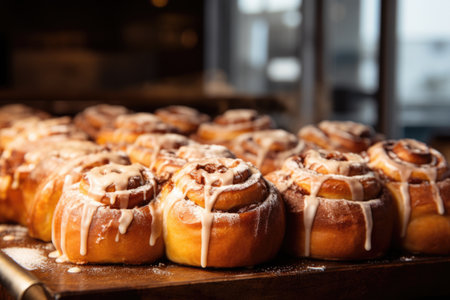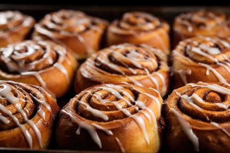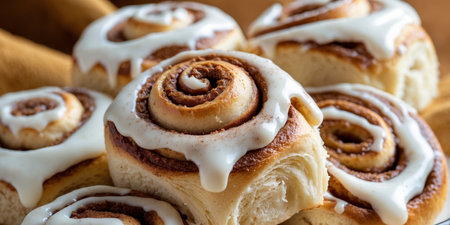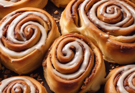 AI Generated. Close Up of Delicious Cinnamon Rolls with Icing