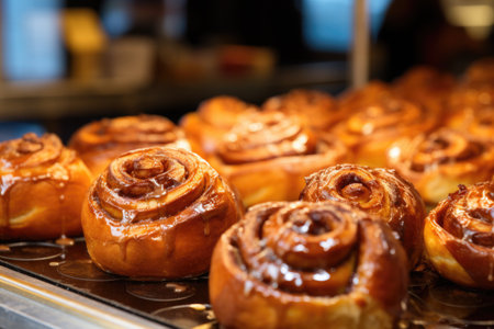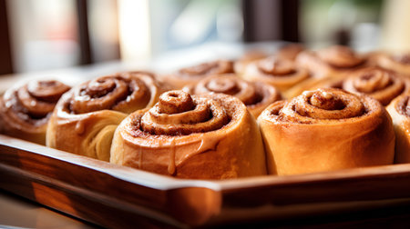 closeup of Fresh homemade Cinnamon rolls or Cinnamon buns in tray in bakery, AI Generated