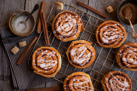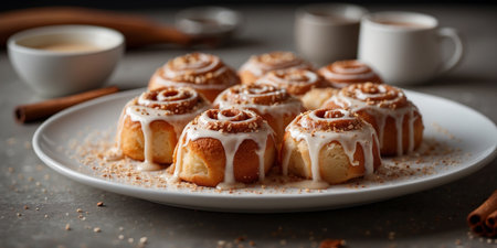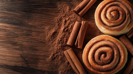 Enjoy a close-up view of freshly baked cinnamon rolls, enhanced by cinnamon sticks and fine spice. Perfect for showcasing warmth and comfort in culinary photography.