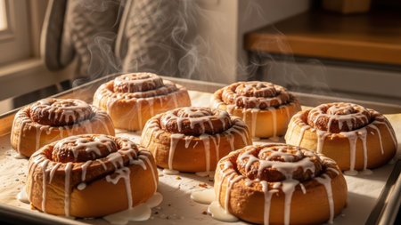 AI Generated. Freshly Baked Cinnamon Rolls with Icing and Steam in Warm Sunlight
