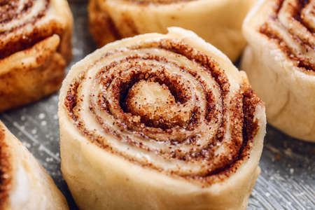 Cinnamon rolls in a baking sheet. Selective focus. Toned.