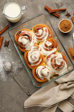 Baking dish of tasty cinnamon rolls with cream on gray background