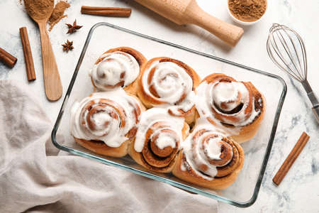 Baking dish of tasty cinnamon rolls with cream on white marble background