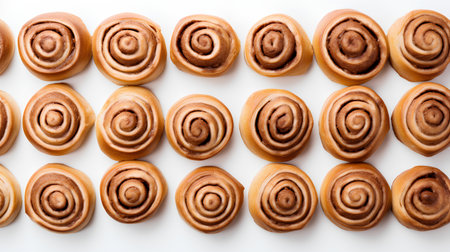 Seamless pattern with cinnamon rolls on white background. Top view.