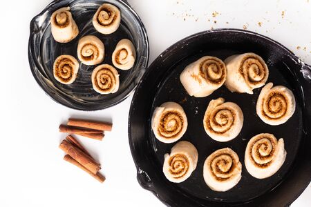 Food baking concept bakery preparation proofed bread dough for cinnamon rolls in skillet iron pan on white background