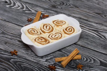Baking cinnabons. The cinnamon dough is in the baking dish. Next to it are cinnamon sticks and anise stars. On pine boards in black.