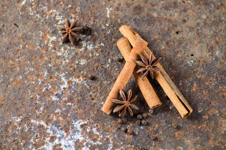 Cinnamon sticks, anise stars and black peppercorns on textured background