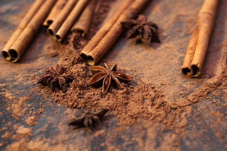 cinnamon ground sticks ceremony cocoa cloves ground coffee spices on wooden table closeup