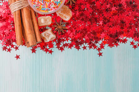 Christmas time decorations with balls, cinnamon and gingerbread on the rustic background