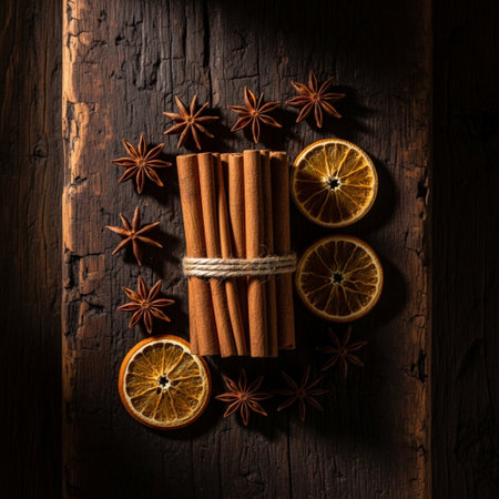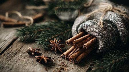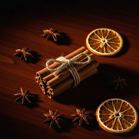Cinnamon sticks and star anise on a wooden table with bokeh background