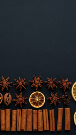 Cinnamon sticks, star anise and cloves on table. copyspace. flat lay. black background