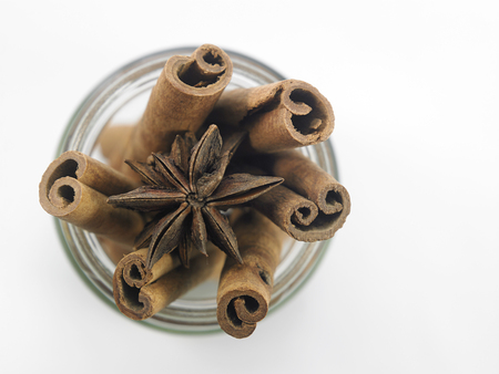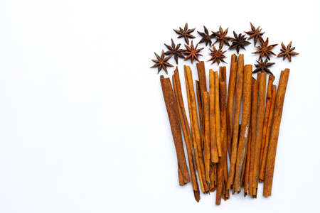 Cinnamon sticks and anise seeds. Good spices for digestions with white background.Health diet