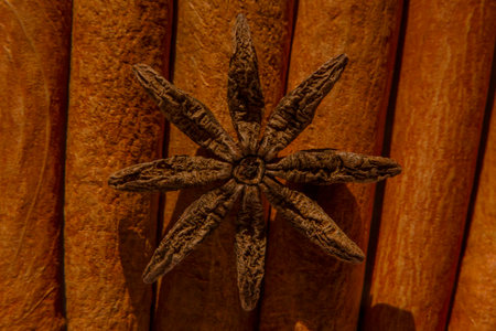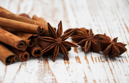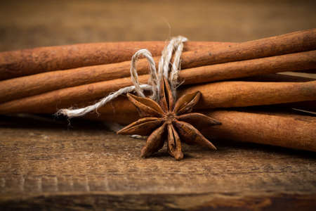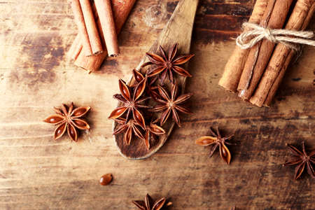 Anise star cinnamon sticks over wood background. Condiments on wooden background.