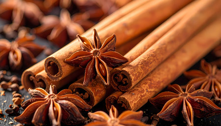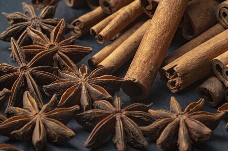 Traditional Christmas spices - Star anise with cinnamon on a dark background.