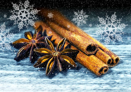 Christmas backround. Cinnamon with star anize on a flour and dark table.Flour and spices for a christmas baking