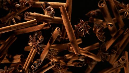 Star anise, cinnamon and ground cinnamon from close range on a black background