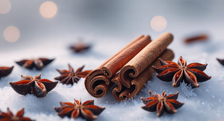 Cinnamon sticks and star anise on a cocoa powder background. Creative idea for spices