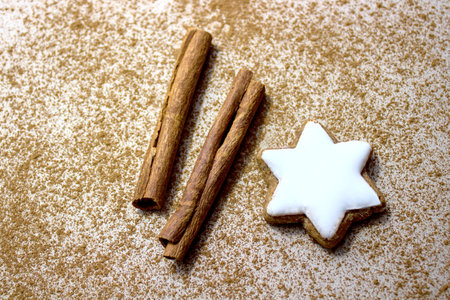 snowflake shaped gingerbread cookie with cinnamon sticks and anise