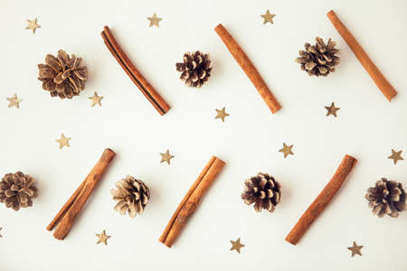 Top view: anise stars and cinnamon sticks on white wooden surface