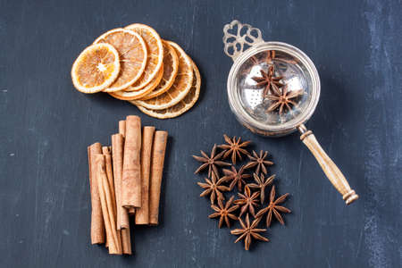 Cup of cinnamon sticks and anise star - spices for mulled wine cooking on dark stone background with copy space