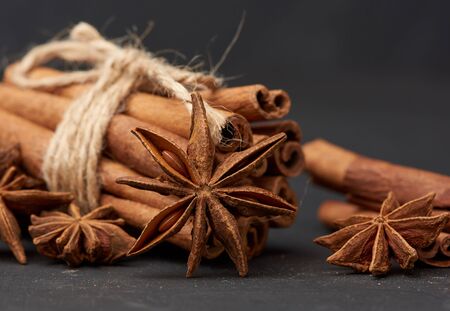 dry star anise with a bunch of brown cinnamon sticks tied with a rope, close up