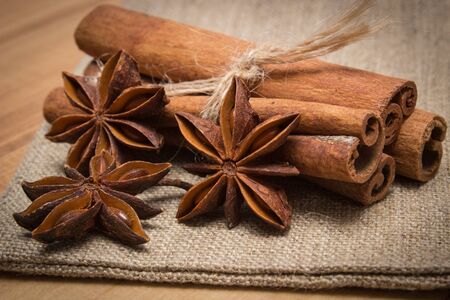 Star of anise and cinnamon sticks lying on jute canvas on wooden table, seasoning for cooking and baking