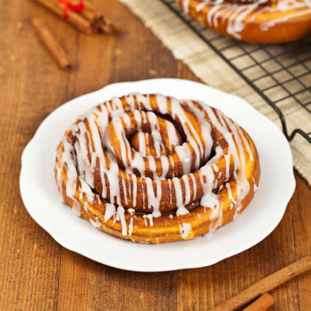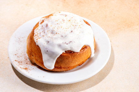 Cinnamon roll or cinnabon with white cream glaze on plate on white wooden background. Traditional homemade sweet buns