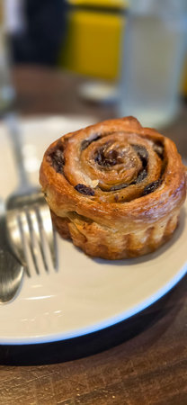 bun with cinnamon and kremoi on a pink plate in a romantic setting with roses