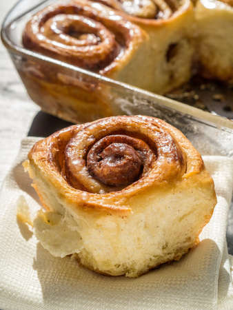Homemade cinnabons in baking dish are taken out of the oven. Front view.