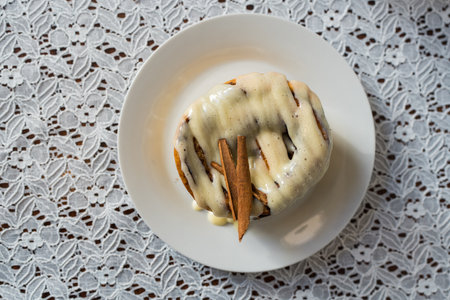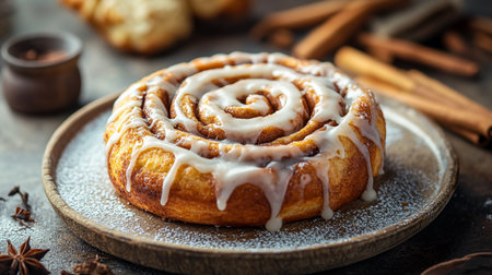 Close up top view of delicious homemade freshly baked cinnamon roll bun or swirl glazed with sugar icing with spice sticks served on craft plate on dark brown table for breakfast