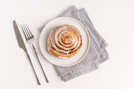 Top view or flat lay of delicious cinnamon roll bun glazed with sugar icing served on a plate with silverware of fork and knife and gray napkin on white wooden table as dessert