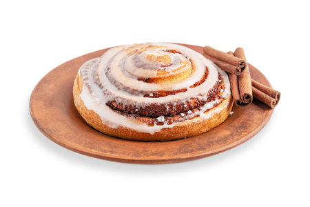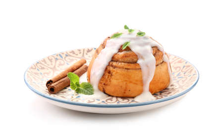 One brown delicious homemade cinnamon roll bun or swirl glazed with sweet sugar icing served on ceramic plate with spice ingredient sticks isolated on white background as pastry