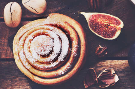 Homemade cinnamon bun with pecan nuts topped with sugar powder on wooden background, table top view