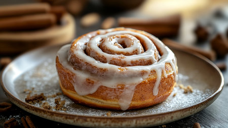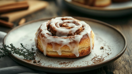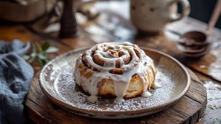 Freshly baked cinnamon roll covered in sweet icing, creating a tempting treat