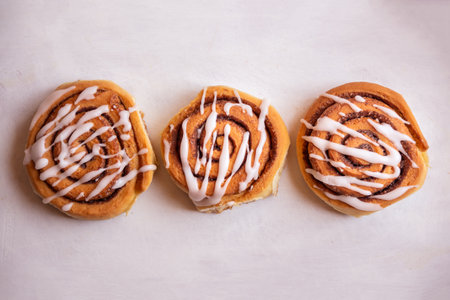Cinnamon rolls buns baking on a white plate breakfast table Top view.