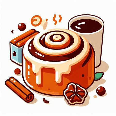 Cinnamon buns with coffee and cinnamon sticks. Vector illustration.