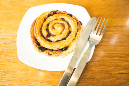 Sweet bun with cinnamon roll put on a white plate isolated on a white background. File contains with clipping path so easy to job.Top view close up shot
