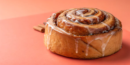Delectable iced cinnamon roll ready to enjoy with coffee on a vibrant coral background