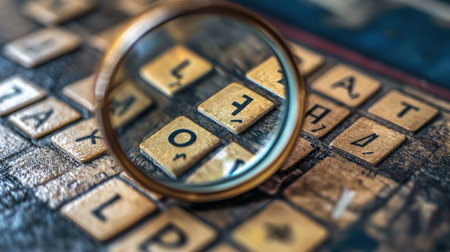A close-up shot showcasing a magnifying glass positioned over vintage keyboard letters on a textured surface, evoking a sense of curiosity and exploration.