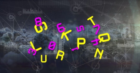 Image of multiple numbers and alphabets over network of connections against dark clouds. Global networking and business technology concept