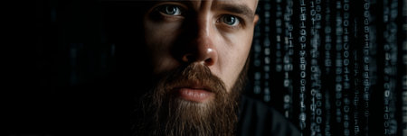 Cybersecurity Expertise. Close-up Of Male Hacker In Dark Room With Binary Code Projection