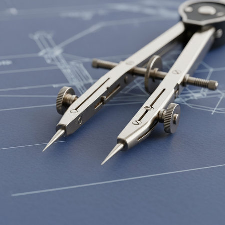 Vintage drafting compass on blue blueprint paper, symbolizing skilled labor, precision, and planning for Workers' Day.