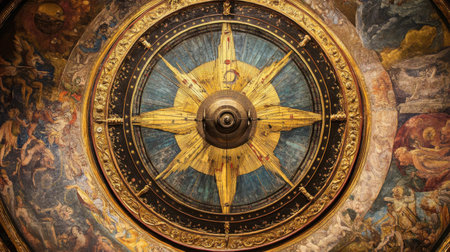A beautifully designed compass rose adorns the ceiling showcasing exquisite artistry and detailing in a historical location.