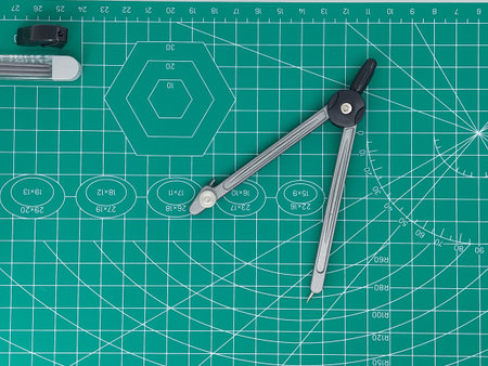 High Angle View Of Drawing Compass on cutting mat