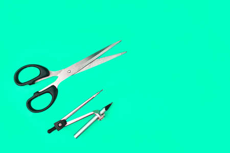 Scissor and a silver color wood pencil attached to a pencil compass placed on a blue paper background