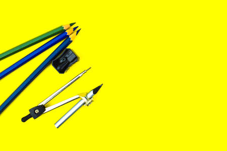 Geometric school instrument and supplies banner background, concept of education, drawing compass on yellow office desk, copy space and top view photo