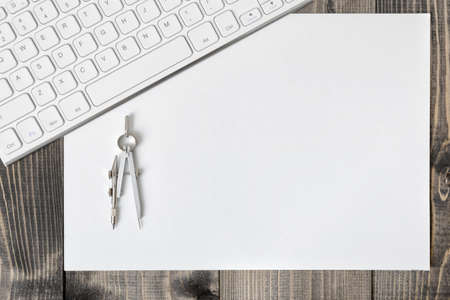 Keyboard, paper and compass on wooden plank. Workplace of architect, constructor, designer in top view. Engineering and Design. Construction and architecture.