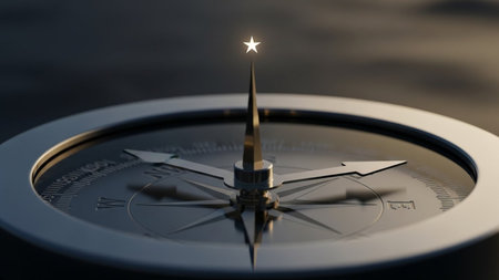 The image depicts a close-up view of a compass with a star shining directly above its needle. The compass is set against a dark background, highlighting its metallic and intricate design. The needle is clearly pointing towards the star, symbolizing guidance and direction.