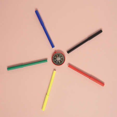 Compass and felt tips in colors lay down on a pink pastel background, making circle. Flat lay square composition, minimal abstract color concept