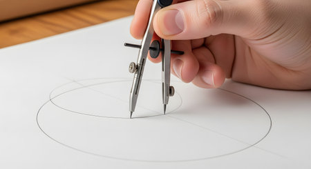 A close-up of a hand holding a metal drawing compass to precisely draw a circle on a sheet of white paper. The image represents concepts of geometry, precision, design, architecture, and technical drawing.